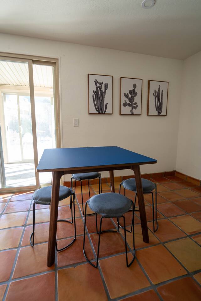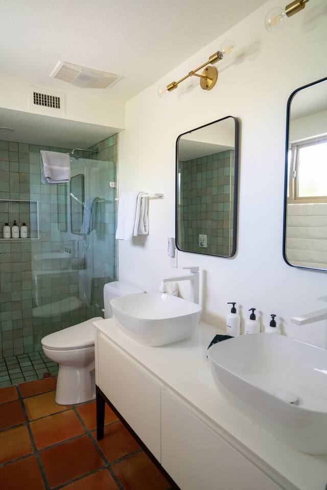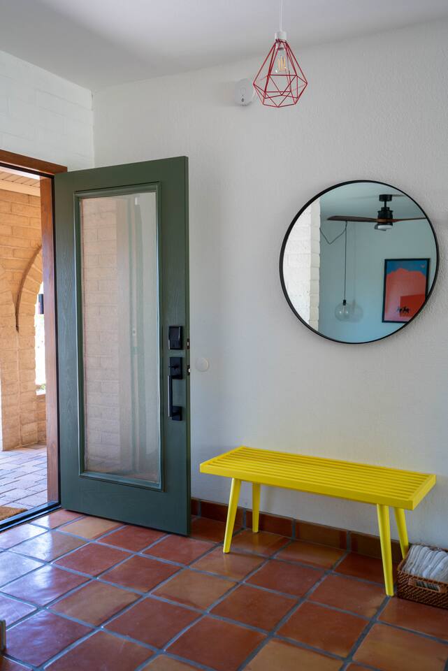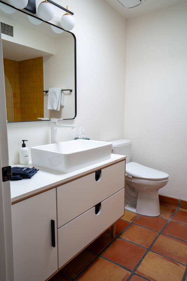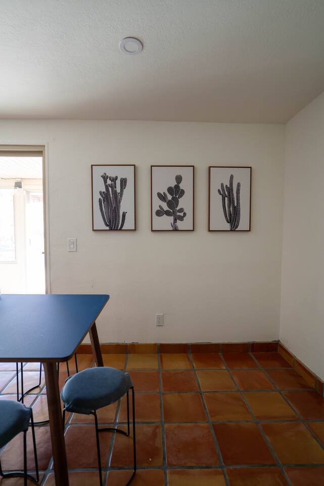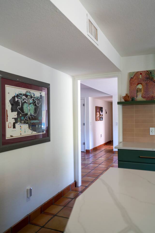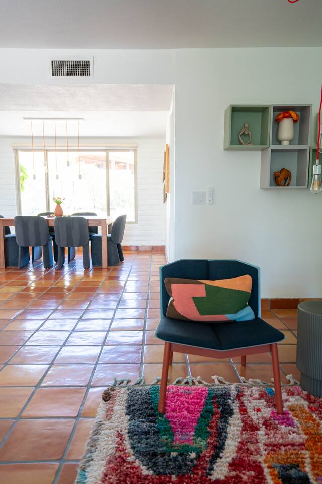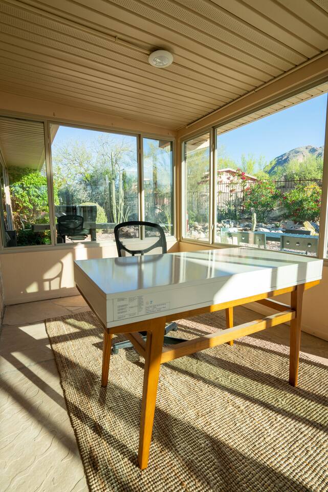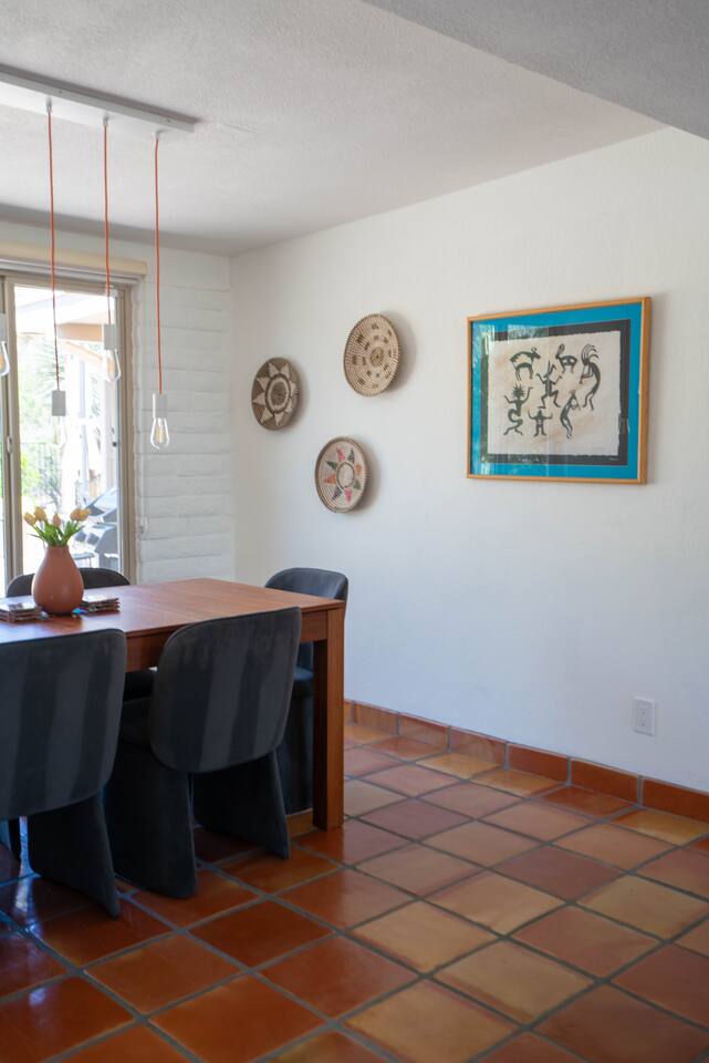 The home has 3 bedrooms and 2 bathrooms along with a dining room, living room, high end chef's kitchen and an Arizona room. There is Saltillo flooring throughout the home. ++Outdoor Spaces++ The backyard has a private heated pool and hot tub - pool towels are provided along with pool toys. Note: there is no additional charge for the pool and hot tub heating, it is included in the daily rate. There are also outdoor dining and lounging areas - all with views of the Catalina Mountains. The perfect place to take in the Sonoran Sun (or open up the umbrella to get some shade) and relax. ++Living Room++ The living room has a 65" 4K Roku SmartTV with a comfortable sofa and 2 chairs. There are pillows and blankets to make it the perfect room for a night in. From the window there are views of the desert landscape with the Tucson city lights visible at night in the distance. ++Dining Room++ The dining room has seating for 6 with picture perfect views of the Finger Rock. ++Kitchen++ The kitchen with marble look quartz countertops, a Bertazzoni induction range, Bosch dishwasher, island, and large stainless steel sink with Grohe faucet is truly a chef's kitchen. There is also a built in microwave, electric water kettle, espresso machine, coffee maker, blender and all the kitchen essentials. For seating there is a kitchen table with 4 stools. In the backyard there is a Weber propane grill. Everything you need to make an amazing meal and memories. ++Arizona Room [Enclosed Porch]++ The Arizona Room (4 seasons room) has amazing view of the Catalina Mountains and the scenic desert landscape that surrounds the home. One side has a dedicated workspace with an ergonomic chair and deck. On the other end is a sofa, 40” 4K TV with Roku, elliptical machine and 2 yoga mats. Perfect place to relax or even do morning yoga. There is a split unit that cools and heats the room as well to help keep it comfortable. ++Primary Bedroom & Bathroom++ The primary bedroom has a king size bed with direct access to a patio via a sliding door with an outdoor bistro seating area. There is also an attached spa-like bathroom with handmade Moroccan Zellige tile shower with a Grohe rain shower and designer vanity. ++Second Bedroom++ The 2nd bedroom has 2 full size beds along with a closet to hang clothes. ++Third Bedroom++ The 3rd bedroom has a queen size bed along with views of the city skyline at night. There is also a pack-n-play crib stored in the closet. All the beds are made of memory foam and are topped with pillow top mattress covers to give them a softer feel. ++2nd Bathroom++ Off the hallway is the second bathroom which has a tub with bright yellow handmade Zellige tile and a large vanity. ++Laundry Room++ There is a laundry room with a full size washer and dryer along with an iron and ironing board. Detergent pods are provided. There is also a utility sink - great for cleaning up hiking or golf equipment. TPT ID: 21475900