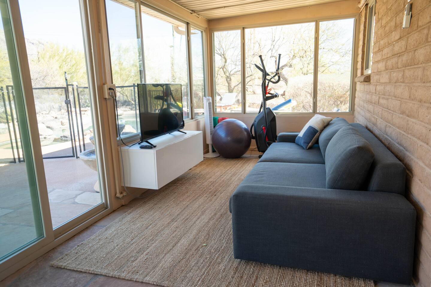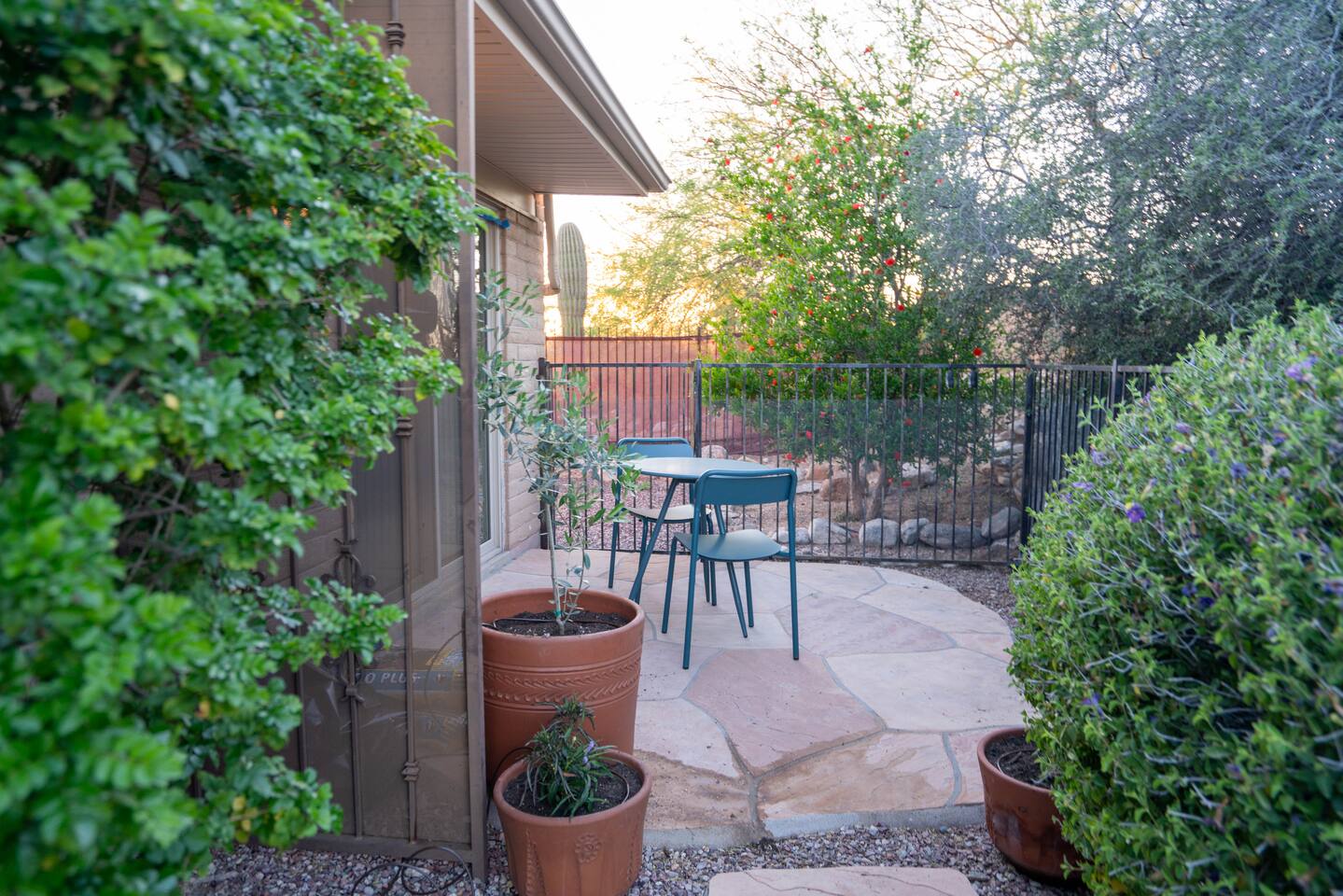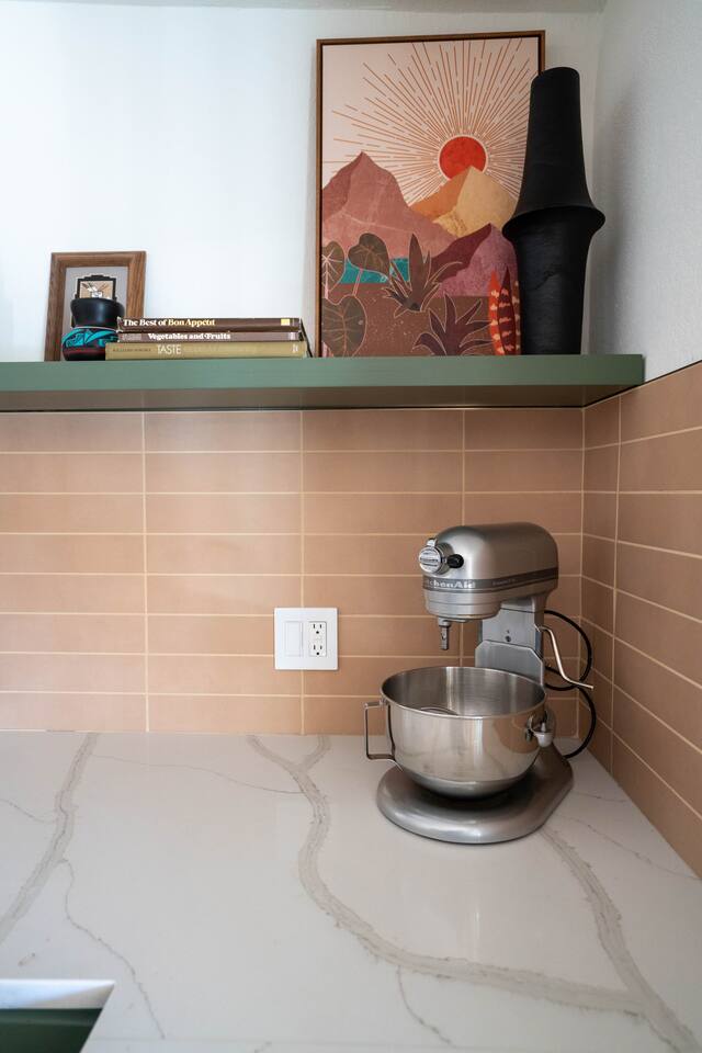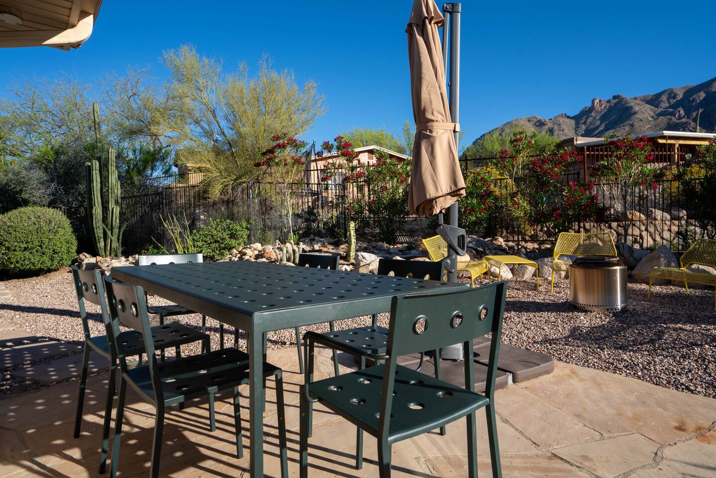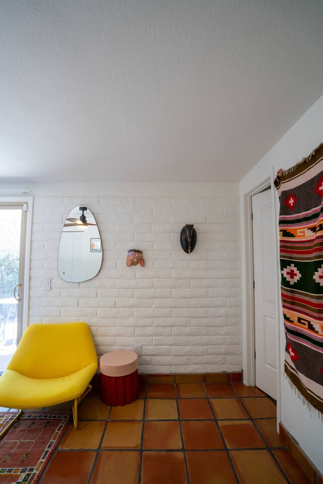 The home has 3 bedrooms and 2 bathrooms along with a dining room, living room, high end chef's kitchen and an Arizona room. There is Saltillo flooring throughout the home. ++Outdoor Spaces++ The backyard has a private heated pool and hot tub - pool towels are provided along with pool toys. Note: there is no additional charge for the pool and hot tub heating, it is included in the daily rate. There are also outdoor dining and lounging areas - all with views of the Catalina Mountains. The perfect place to take in the Sonoran Sun (or open up the umbrella to get some shade) and relax. ++Living Room++ The living room has a 65" 4K Roku SmartTV with a comfortable sofa and 2 chairs. There are pillows and blankets to make it the perfect room for a night in. From the window there are views of the desert landscape with the Tucson city lights visible at night in the distance. ++Dining Room++ The dining room has seating for 6 with picture perfect views of the Finger Rock. ++Kitchen++ The kitchen with marble look quartz countertops, a Bertazzoni induction range, Bosch dishwasher, island, and large stainless steel sink with Grohe faucet is truly a chef's kitchen. There is also a built in microwave, electric water kettle, espresso machine, coffee maker, blender and all the kitchen essentials. For seating there is a kitchen table with 4 stools. In the backyard there is a Weber propane grill. Everything you need to make an amazing meal and memories. ++Arizona Room [Enclosed Porch]++ The Arizona Room (4 seasons room) has amazing view of the Catalina Mountains and the scenic desert landscape that surrounds the home. One side has a dedicated workspace with an ergonomic chair and deck. On the other end is a sofa, 40” 4K TV with Roku, elliptical machine and 2 yoga mats. Perfect place to relax or even do morning yoga. There is a split unit that cools and heats the room as well to help keep it comfortable. ++Primary Bedroom & Bathroom++ The primary bedroom has a king size bed with direct access to a patio via a sliding door with an outdoor bistro seating area. There is also an attached spa-like bathroom with handmade Moroccan Zellige tile shower with a Grohe rain shower and designer vanity. ++Second Bedroom++ The 2nd bedroom has 2 full size beds along with a closet to hang clothes. ++Third Bedroom++ The 3rd bedroom has a queen size bed along with views of the city skyline at night. There is also a pack-n-play crib stored in the closet. All the beds are made of memory foam and are topped with pillow top mattress covers to give them a softer feel. ++2nd Bathroom++ Off the hallway is the second bathroom which has a tub with bright yellow handmade Zellige tile and a large vanity. ++Laundry Room++ There is a laundry room with a full size washer and dryer along with an iron and ironing board. Detergent pods are provided. There is also a utility sink - great for cleaning up hiking or golf equipment. TPT ID: 21475900